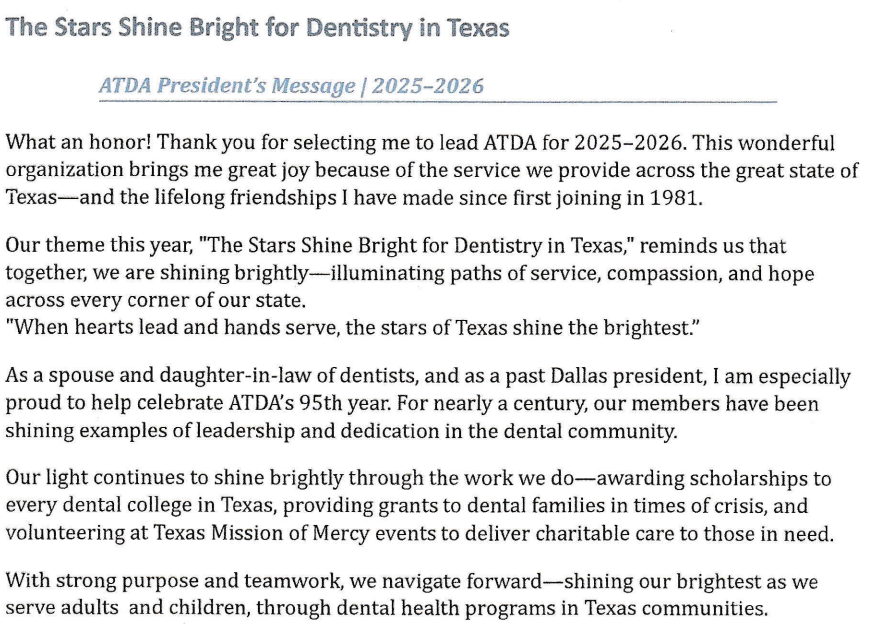 MISSION STATEMENT: To provide support for the spouses of Texas Dental Association members through education, fellowship, and service, and to foster the positive image of organized dentistry, working in partnership with the Texas Dental Association.