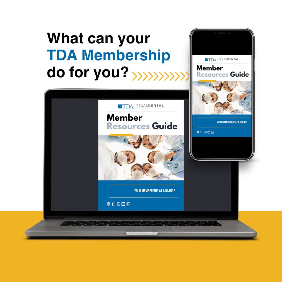 Being a TDA member means being a part of something bigger—and it means you get valuable benefits, too. Whether it's a time of uncertainty, or business as usual, TDA helps our members every day.Click here to download our Member Resources Guide (PDF) and find out what your membership in TDA, ADA, and your local society can do for you.